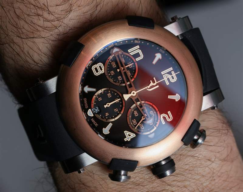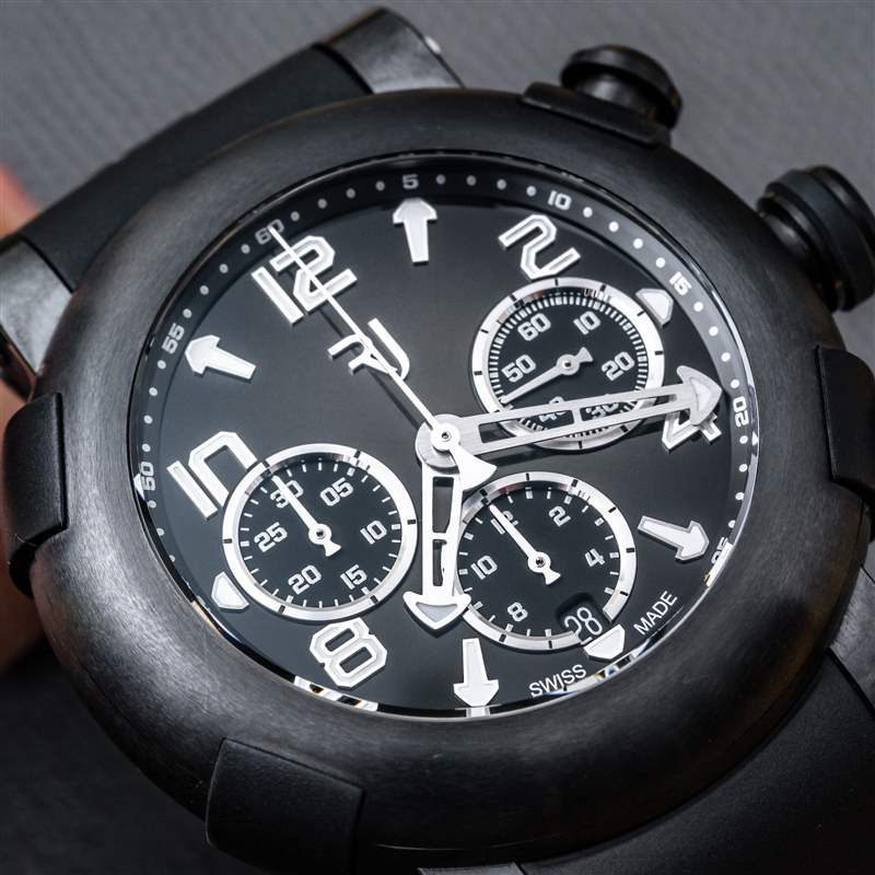 仔細觀察 Arraw 表盤,您會發現其優質的材料和迷人的設計。外觀非常羅曼杰羅姆,但也有舊保時捷設計的元素(RJ在幾年前模仿過)。風格令人愉快,但不像我想要的那樣原始。它還存在易讀性問題,因為鏤空的拉絲指針懸停在許多以相同方式完成的零件上。如今,設計師們似乎完全沉迷于鏤空的手,他們對它們的論點是雙重的。首先,他們說鏤空指針有助于更輕松地閱讀計時碼表子表盤。好吧,我同意這一點,但我提醒他們,大多數人在 100 次中可能有 99 次依靠表盤來讀取時間。因此,考慮到這種用法,重點應該放在讀取時間的易讀性上。第二,設計師只是認為鏤空的手更“現代”。再說一次,這可能是真的,但我不會僅僅因為時尚而給人們積分。